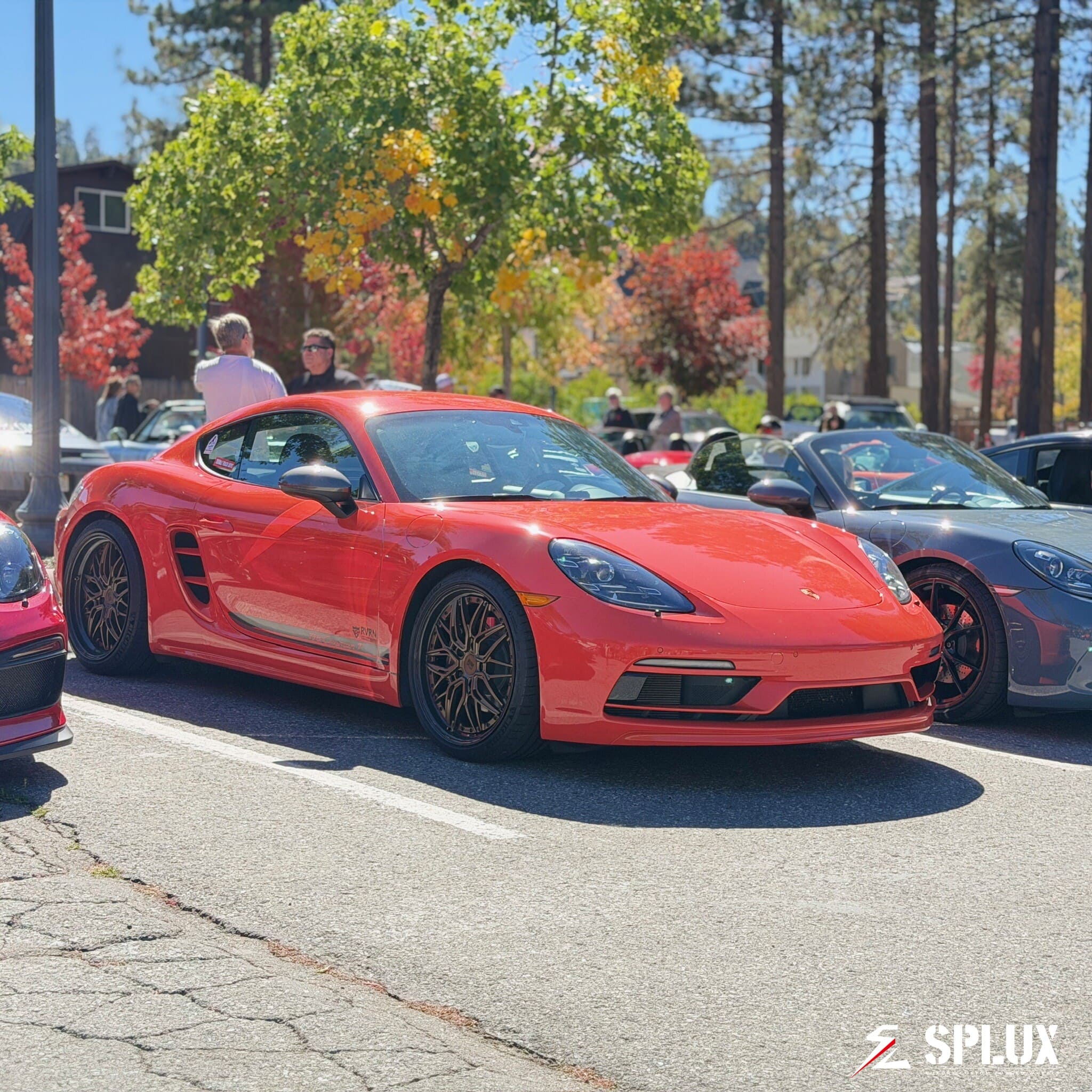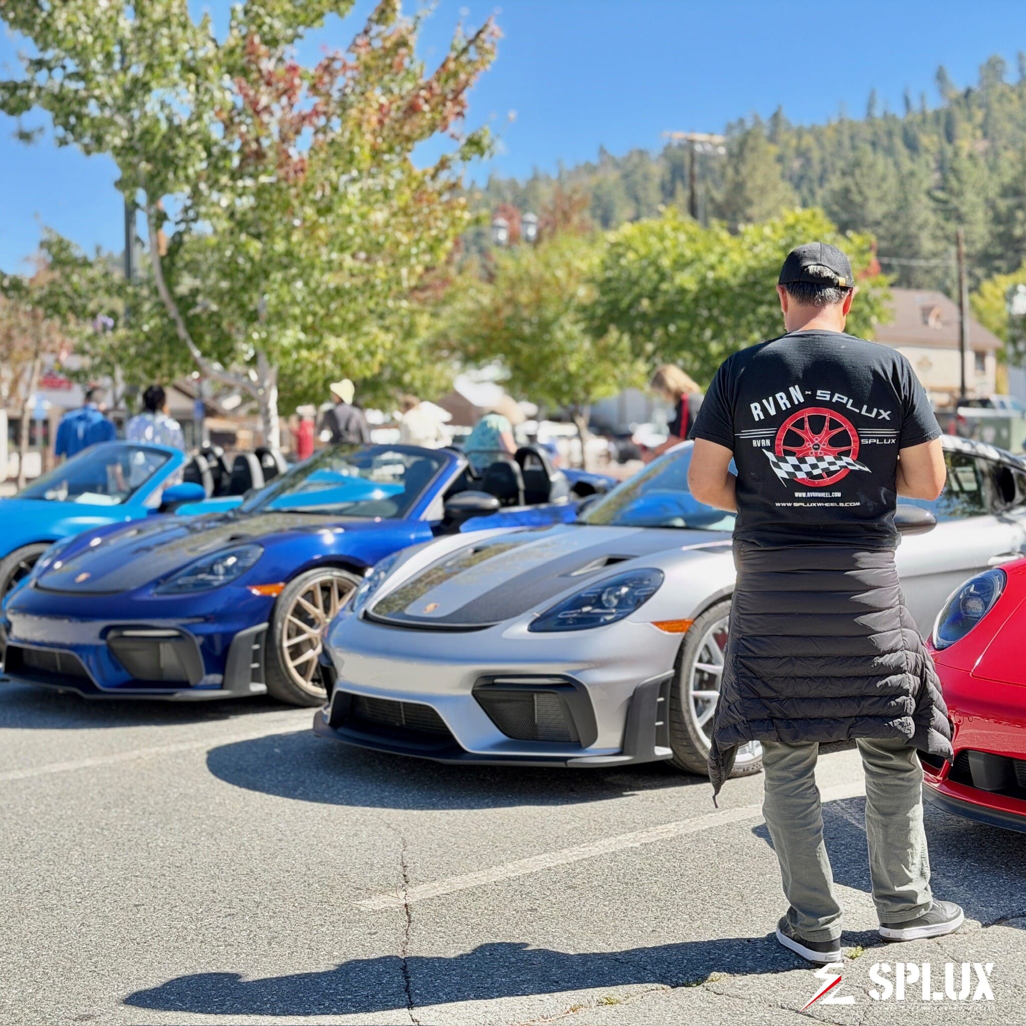 Pulling up to the Bartlett Parking Lot in Big Bear Village (630 Bartlett Rd), the atmosphere was electric. Surrounded by the entire history of Porsche—from early 356s to the latest 992s—it was a powerful reminder of how dedication to engineering and design creates a timeless legacy. My own Cayman T, which represents Porsche's commitment to the purest driving experience, was wearing a set of wheels that reflect that very same ethos: my Splux SD-01S Fully Forged Deep Dish Wheels.